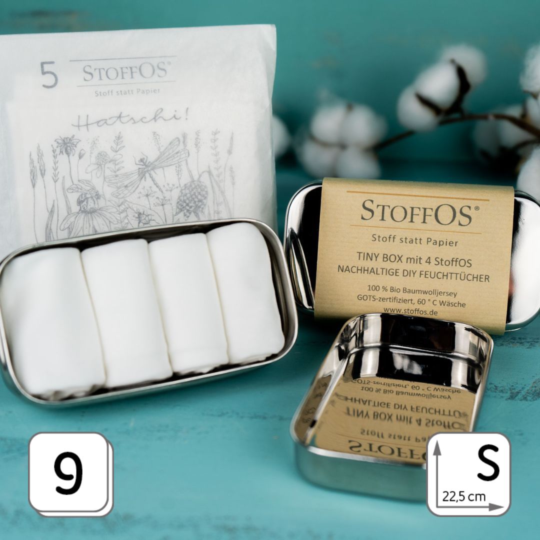 Mit Deinen Stofftaschentüchern-StoffOS - als DIY-Feucht- oder Erfrischungstüchern, kurz E-Tüs, bist Du als Trendsetter für jede Lebenslage gerüstet- unsere coole Edelstahlbox macht‘s möglich. Mit den StoffOS fällt der Wechsel von "Einweg" Feuchttüchern zu „Mehrweg“ E-Tüs besonders leicht.